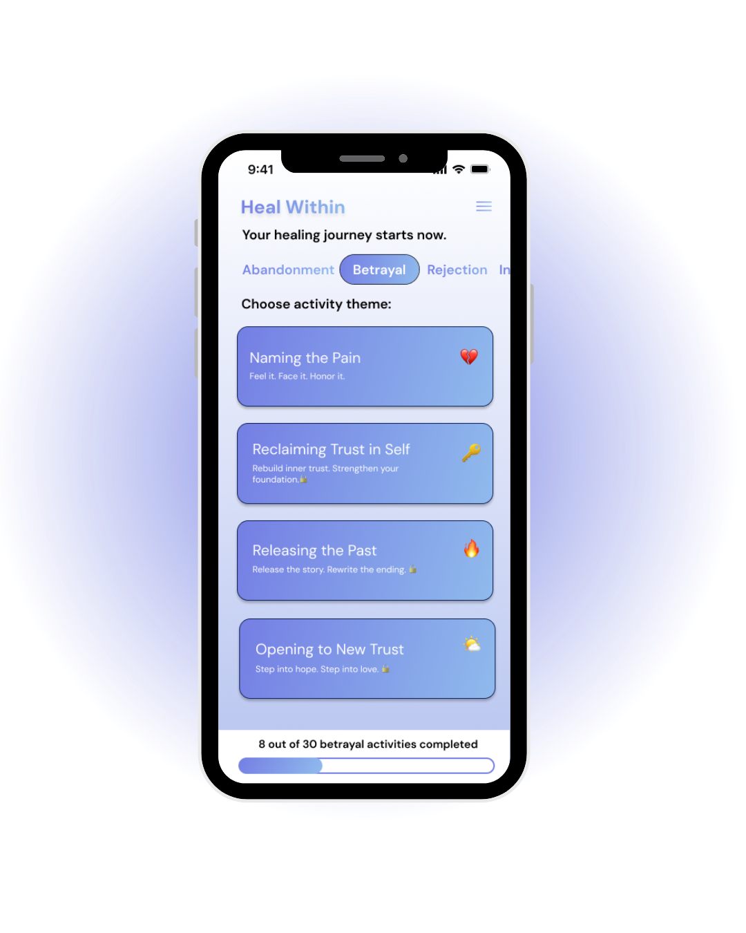 Emotionally-Curated Healing Journeys: Not generic journaling. Each path is built around real emotional wounds — abandonment, betrayal, rejection — with reflection prompts designed to meet you exactly where it hurts.