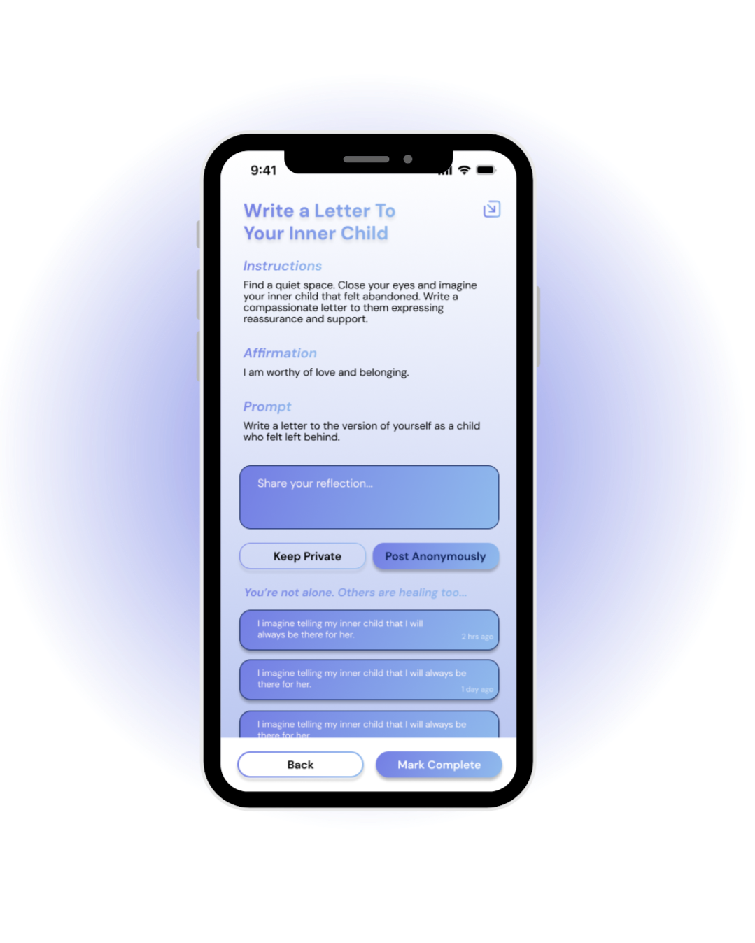 Anonymous Sharing (Optional, Always Safe): Post your reflections anonymously, or keep them private. Either way, you’re healing with others who get it — without needing to explain yourself.